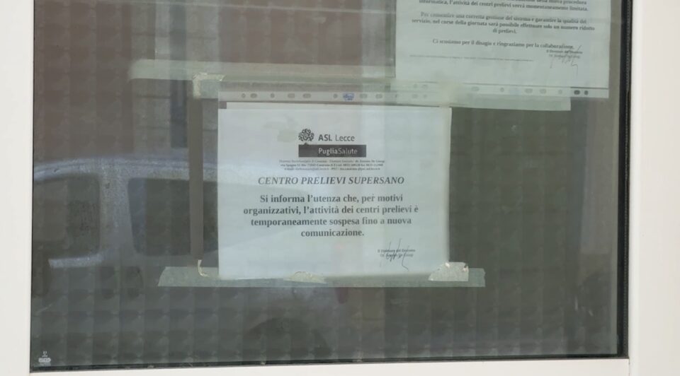 “Per motivi organizzativi, l’attività dei centri prelievi è temporaneamente sospesa fino a nuova comunicazione”. È il messaggio affisso sulla porta dell’ambulatorio di Supersano. Un avviso firmato dal direttore del distretto Asl di Casarano Antonio De Giorgi, che riguarda anche i centri prelievi di Taurisano e Ruffano. Dal 16 dicembre il servizio non è più disponibile. Un disagio pesante, che colpisce soprattutto anziani, persone fragili e chi non può spostarsi autonomamente verso gli ospedali.